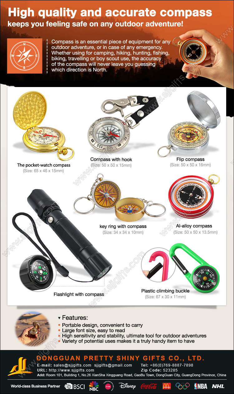 Pretty Shiny Gifts supplies various of compasses, such as the pocket-watch compass, compass with hook, flip compass, keyring with compass, al-alloy compass, plastic compass with carabiner, flashlight with compass and more. Whether using for camping, hunting, fishing, hiking, biking, travelling, boy scout use, special gifts or promotional. Variety of potential uses makes it a truly handy item to have. Besides, the compass shown here are our open designs which are free from mold charge. And you can also choose your own designs by laser engraving or printing as we mainly customize our client’s design.