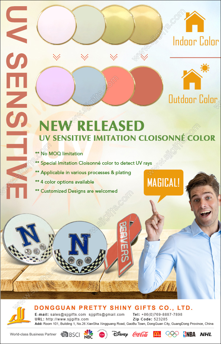 There are various metal badges, but how to get a special customized badge to make your logo more attractive? Come to Pretty Shiny Gifts, this UV sensitive enamel pin will make your badge more outstanding from the others. The color will change under UV rays, it’s total different from color indoor to outdoor. The longer time the exposure, the deeper the color is. Kindly find photo, video as shown here. Our factory has 4 colors available for your choosing from, NO MOQ request, imitation hard enamel processing. Suggest to make a big space for UV enamel to get a better UV sensitive badge, the small color area may affect the final pin image and difficult to show the color change well.