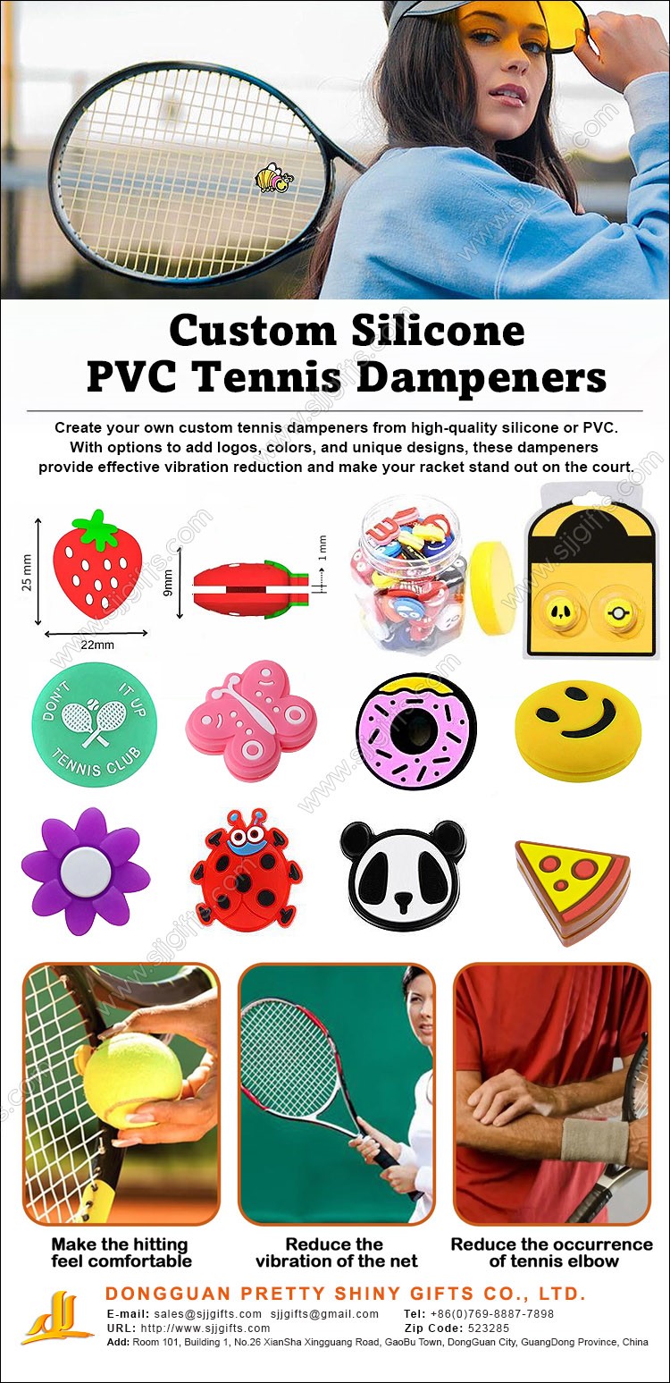 Custom tennis dampeners are essential accessories for players looking to reduce vibration and improve their game performance. Crafted from non-toxic soft PVC or silicone materials, these dampeners are designed to absorb shock and noise, providing a smoother playing experience. Customizing your tennis dampeners with logos, text, or unique designs makes them not only functional but also a great way to showcase team spirit, promote a brand, or create personalized gifts for tennis enthusiasts.