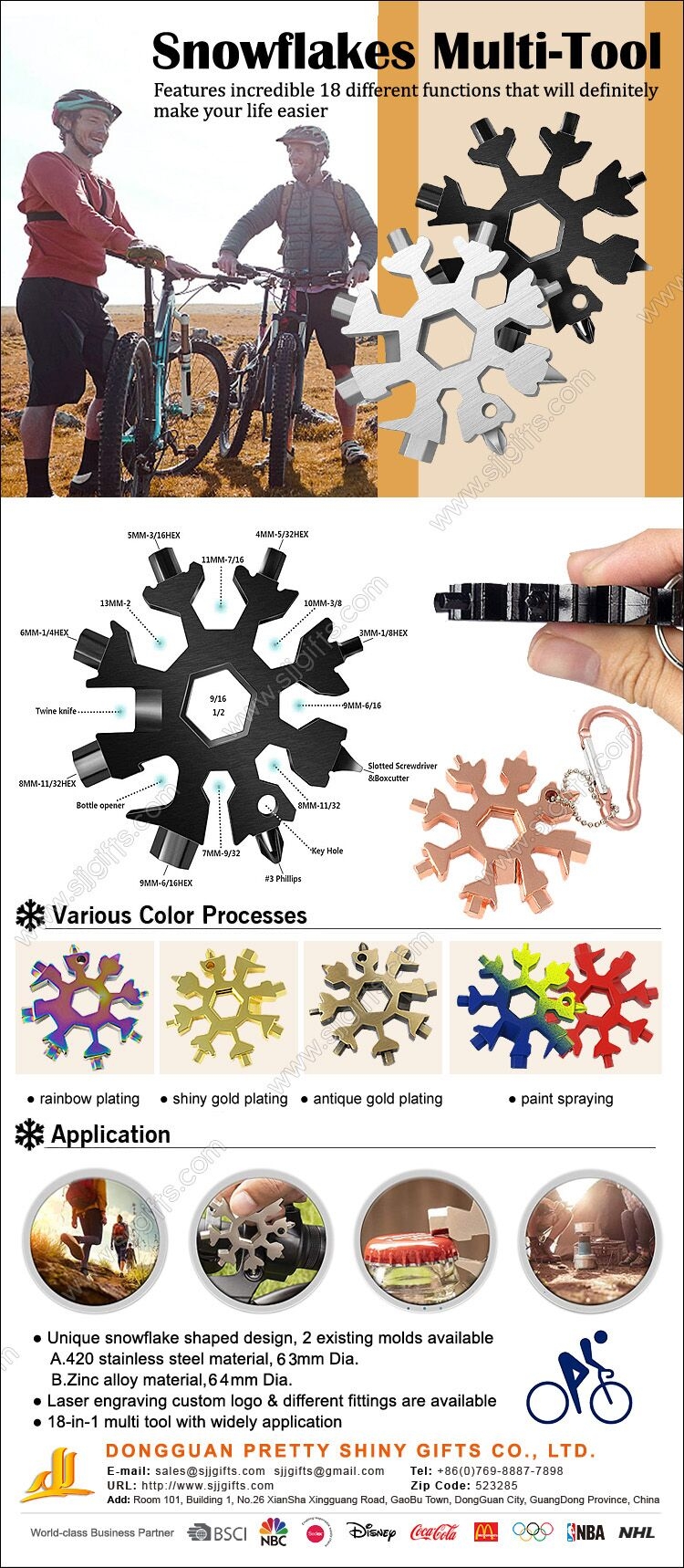 Pretty Shiny can supply the snowflake multi tool in various finish and different attachment, such as split ring, carabiner to attach to keychain or backpacks perfectly. You can also use string so you can carry it easily or just decorate it in the Christmas tree. Customized printing and engraving logo also make the tool a great promotional item for long-term practicality and brand awareness.