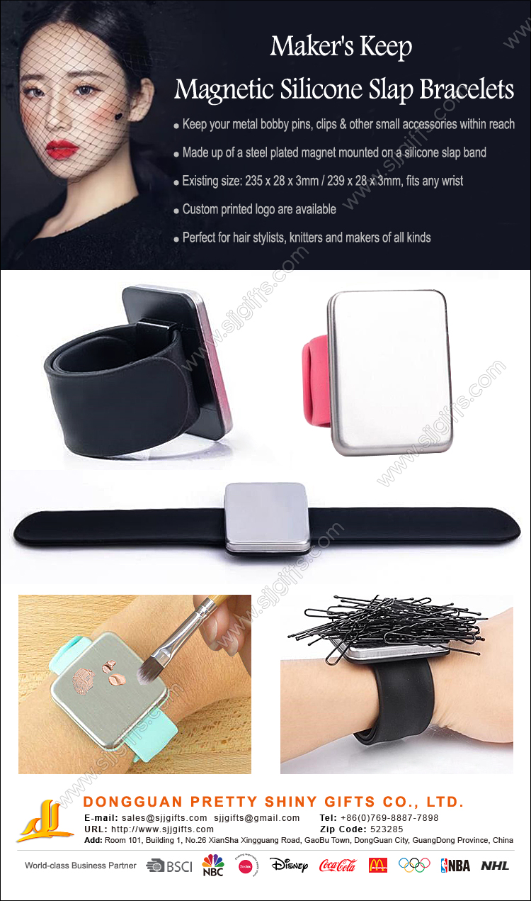 Our factory developed 2 existing molds of silicone bracelets for your choosing from, which fits any size wrist. The slap bracelet itself is eco-friendly flexible silicone material which is smooth and comfortable to wear. You can design the silicone bracelets color and have your logo printed on, use it as a decoration for your daily dressing. The brushed steel plated magnet can keep pins, nails, screws, paper clips or endless small steel accessories close at hand while you’re at work, doing hair for weddings, working around the house or even for fly fishing. Because of its practical & multi-functional, the makeup artists love the hair clips bracelet so much. Not only save time and make them work more efficiently, but also great for hair salon use.