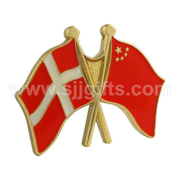 The symbol flag pin, country crossed flag pins normally finished in die struck bronze or iron material with imitation hard enamel or soft enamel color filled, additional printing, epoxy as an option. Featured a spur nail with butterfly clasp on the back which makes the pin easy to wear on the shirt, sweater, backpack. The standard finish is shiny gold plating with front side high polished. Other finishes like nickel, satin gold also available.