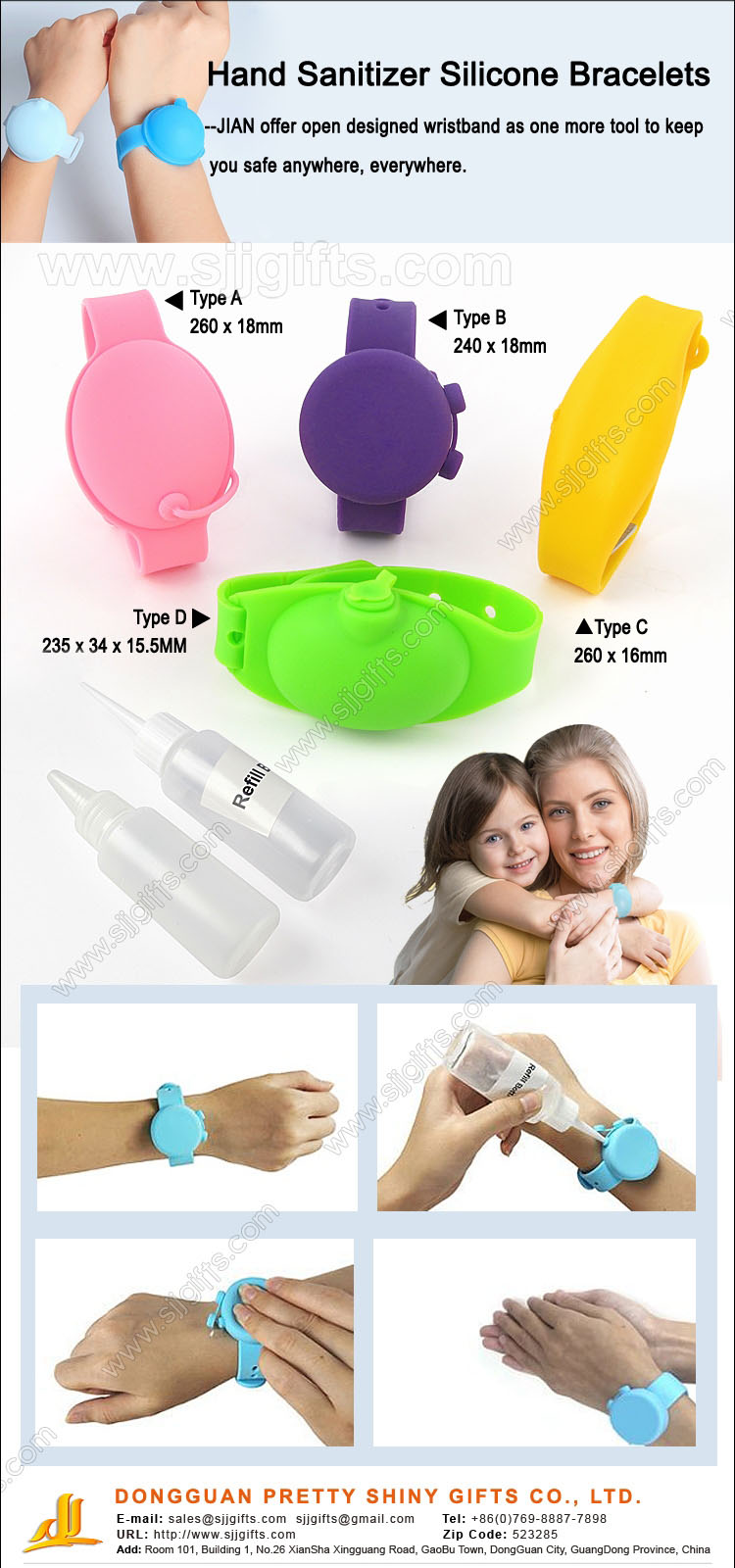 Hand sanitizer is an essential hygiene tool while the pandemic is still strong and widespread. We’ve had to reconsider everything we familiar about how to protect our safety and health, like regular handwashing, proper hygiene and hand sanitization, which is especially true for people who work in the public service sector: doctor, nurse, clerks in supermarket, restaurant servers etc. Most of people now carry a little bottle of hand sanitizer wherever they go, but sometimes forget to bring in a rush, or lose it, or not accessible when they need it. Pretty Shiny Gifts Inc., Ltd offer open designed hand sanitizer silicone bracelet as one more tool to keep you safe anywhere, everywhere. This handy silicone wristband can keep your hands germ-free wherever you go. And very easy to use anytime, you can sanitize in seconds and always have clean hands. Not only protecting yourself, but also increase the public hygiene health and safety standard. With this wristband, you don’t need to touch publicly shared bottles of hand sanitizer or soap dispensers. Perfect for the whole family to clean hands while at work, school, shopping or traveling.