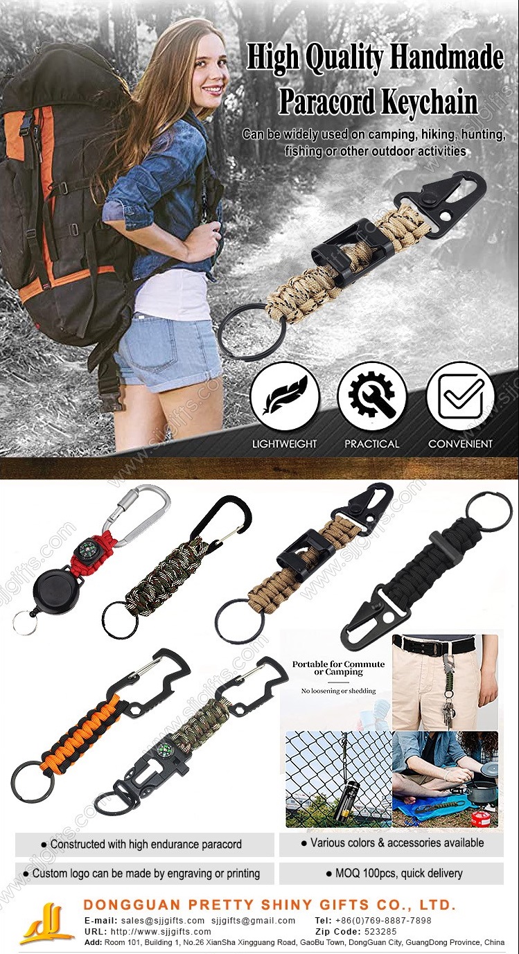 Pretty Shiny Gifts has been focusing on the paracord products for more than 10 years. Except for the paracord keychain, paracord bracelets, paracord lanyards, multi-function knifes, compasses are available too, the market is covered all of world. Contact us at sales@sjjgifts.com right now for the multiple potential tool – survival keychains.