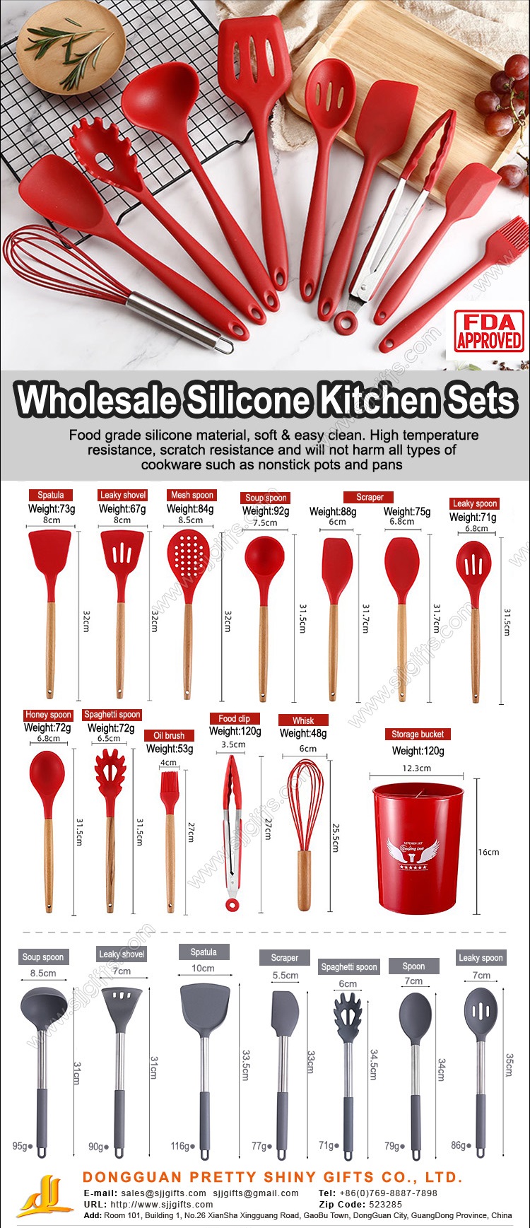 All these kitchen sets’ heads are finished with food grade silicone material. Not only can pass all kinds of test standards by European or US Institution, but also BPA free and FDA approved. And just because of its soft & easy clean characteristic, silicone kitchen sets are considered as a better cooking material than plastic and enjoying a very popular market by all the people nowadays. Higher temperature resistance, scratch resistance and will not harm all types of cookware such as nonstick pots and pans. Most importantly, silicone kitchen tools are less prone to harboring bacteria and germs, good to our health. The silicone heads are available in cherry red, dark gray and other pop of colors are also available upon request.