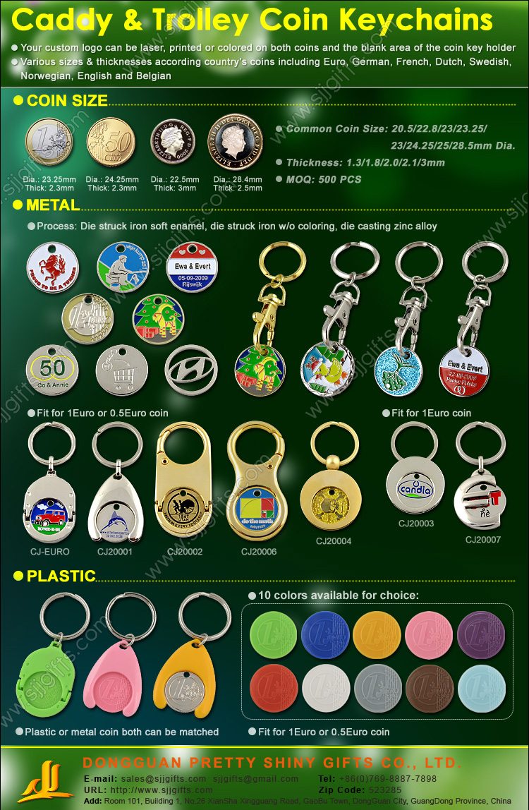 Pretty Shiny Gifts supplies wholesale trolley token & caddy coin keychains in various material, such as die struck iron, die casting zinc alloy, plastic. For plastic material, have existing 10 colors available for choice. Die struck iron soft enamel without epoxy is the dominating material for caddy coin keychains while etched brass soft enamel is less appealing because of the higher cost. Zinc alloy is the best material for the coins with inner piercing or cutouts. But no matter you’re choosing brass, iron or zinc alloy, all the coins will be three sides polishing (front side, back side, edge) to get shiny surface.