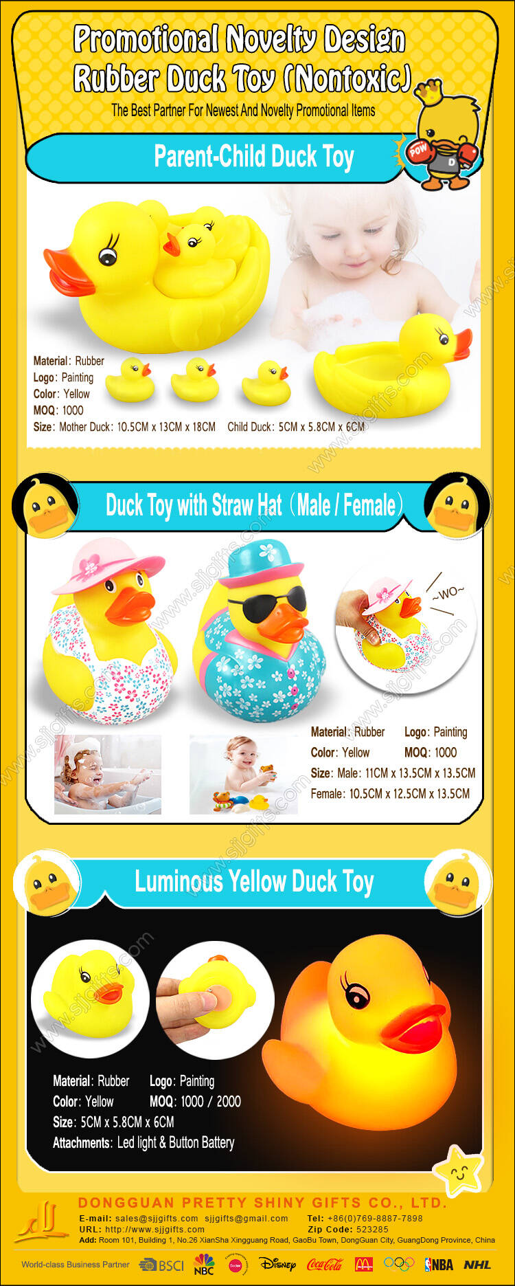 Pretty Shiny offers various existing styles of rubber ducks, including mommy with baby ducks set, luminous yellow ducks, male/female duck with straw hat or squeaky sounds. All of them are free of mold charge. Non-toxic safe rubber material with their bright color, smooth texture since babies have extremely sensitive skin. Aside from being a bath safety must, this cute duck is also water-tight, mildew-resistant, and fun for baby to play with, making it a true bathing best friend.
